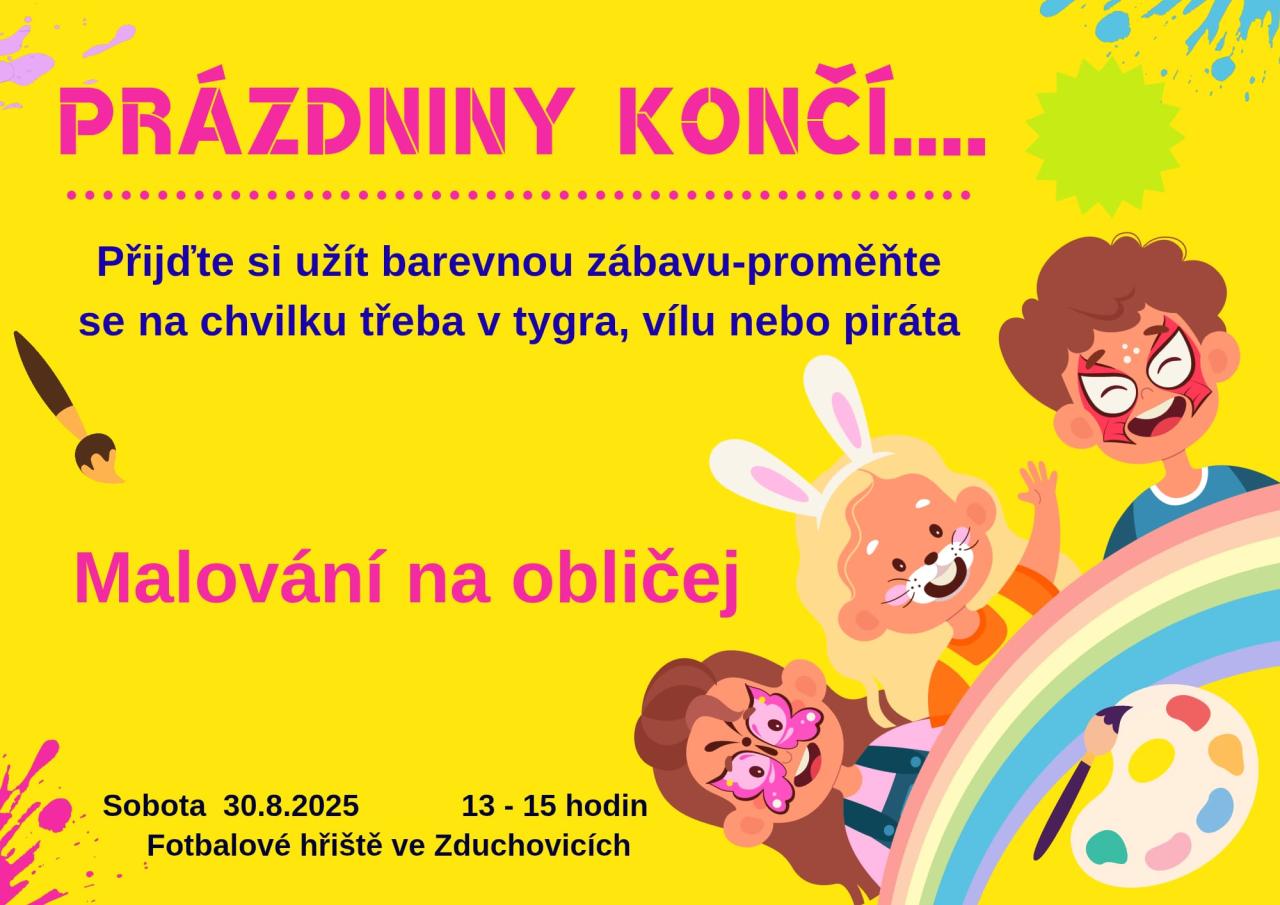 SDH Zduchovice zajistil na hasičskou soutěž v sobotu 30.08. na fotbalovém hřišti ve Zduchovicích malování na obličej pro děti. Přijďte se rozloučit s prázdninami barevnou zábavou.