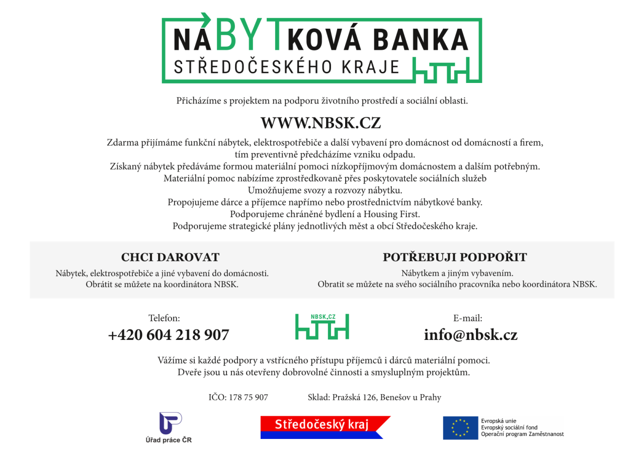 Možnost darování nevyužitelného staršího funkčního nábytku, elektrospotřebičů a dalšího vybavení pro domácnost. Získaný nábytek je nabízený formou materiální pomoci nízkopříjmovým domácnostem přes sociální pracovnice obce.