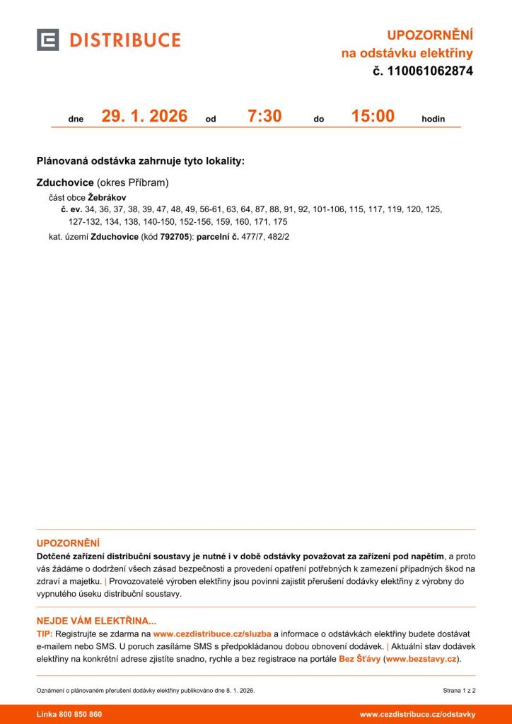 Upozornění na odstávku elektřiny - Žebrákov 29. 01 2026 Typ: PDF dokument, Velikost: 375.27 kB